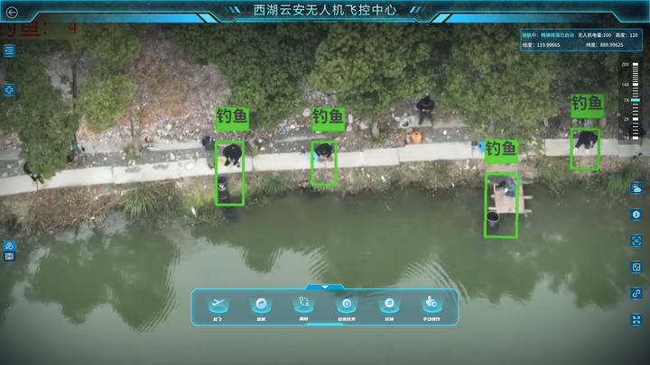 4 月 18 日,無人機在西湖轄區開展河道巡檢作業時,通過實時監控畫面捕捉到某河段存在違規垂釣行為。云安智慧管理平臺同步接收事件預警信息后,第一時間將違規情況推送至飛控指揮中心。指揮中心迅速調度附近巡邏警力趕赴現場,執法人員抵達后依法對垂釣人員進行勸離,并同步開展水域保護法規宣傳,及時消除了河道管理安全隱患。